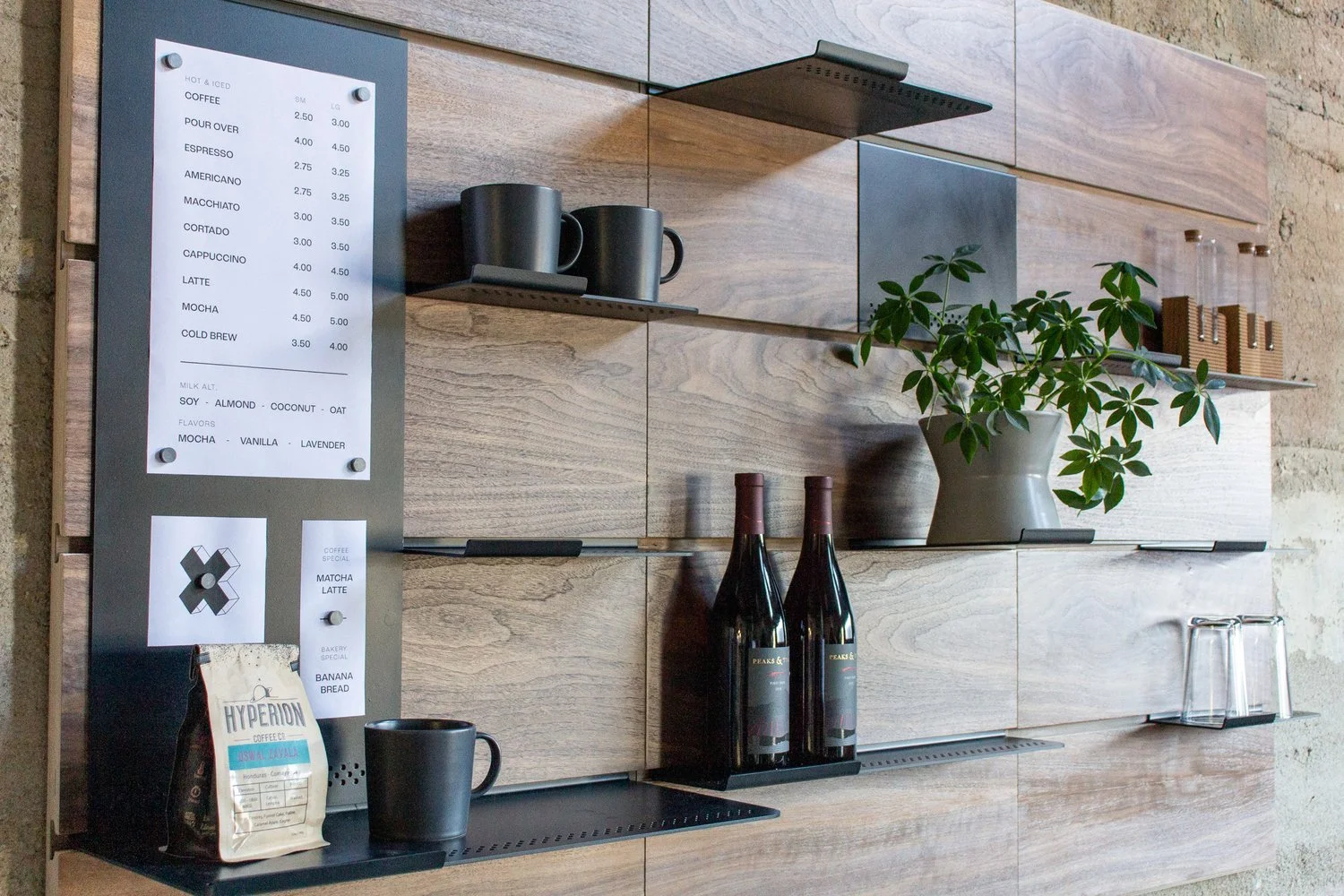 The Slat Walls are a rich walnut veneered flexible shelving system. The slat wall system includes walnut veneered panels, steel shelves and a sleek magnetic sign.